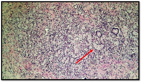Photomicrograph showing goblet cell carcinoid of the appendix. Cytological detail of the “ring with bezel” cells (hematoxylin–eosin, original magnification: 20×). An example of a ring with bezel cells is indicated with a red arrow.