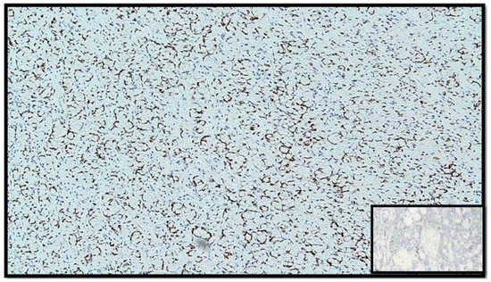 Immunohistochemical reaction with anti-chromogranin A antibody. Note the widespread positivity in the GCC component (IHC, original magnification: 20×). Box: negative control.