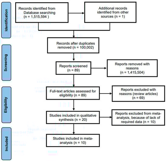Research information system (RIS)-formatted references were exported from the databases, and studies were automatically appraised based on the inclusion criteria, then imported into CADIMA. CADIMA is a free web tool facilitating the conduct and assuring for the documentation of systematic reviews. The 89 studies that were imported into CADIMA were evaluated based on their titles and abstracts. The researchers evaluated the studies two times before discussing whether the studies should be chosen for full-text review. Conflicts were resolved by group discussions between the researchers. After the initial discussion, the researchers agreed that 89 studies should be selected for further appraisal using the inclusion criteria. During the second phase of article assessment, the researchers again screened the 89 full-text articles two times independently. Conflicts were resolved by group discussions. After discussion, 69 articles were excluded because the they were review articles, and 20 articles were identified as appropriate for the systematic review. Owing to high heterogeneity, 10 studies were excluded, and 10 remained for meta-analysis. The PRISMA flow chart presented in Figure 1 depicts the search and inclusion process for this systematic review.