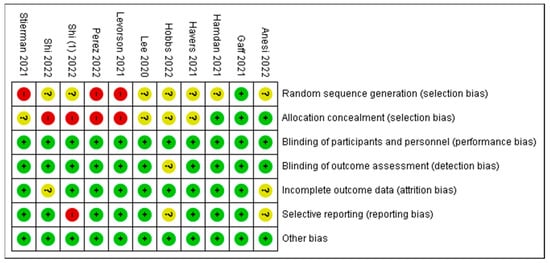 Risk-of-bias summary for 10 reviewed studies [15,16,17,18,19,21,23,25,26,33].