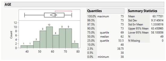 Forty-nine patients, averaging 61 years old, mostly males (89.8%, Table 1 and Table 2), and ranging for the 50% between 53.5 and 69 y.o., comprised the whole population (Figure 1).