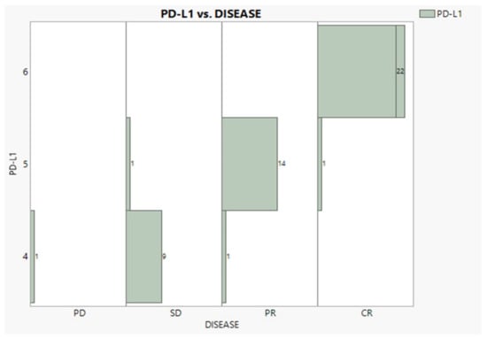 No significant effect of any questionnaire response was found between the time intervals (before and after treatment with immunotherapy), as Figure S1 shows in detail for the paired t-test results. A significant effect of PD-L1 was not statistically documented (p-values greater than 0.05) across the expression groups, concerning either mean differences or the means of mean sums between pairs’ responses.