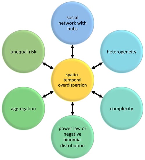 In this section, a proposed framework of spatiotemporal overdispersion in epidemiology is presented. The framework consists of relationships among social network, power law distribution, negative binomial distribution, heterogeneity, complexity, aggregation, and risks in host–parasite systems (Figure 1). These concepts are related to the study of systems with spatiotemporal overdispersion leading to parasite aggregation, and hence, I propose that future studies should consider these concepts in their theoretical, experimental, and computational frameworks [3,13,20,21]. Overdispersion is the link among the concepts presented here. In many computational or experimental studies, overdispersion is detected first (variance is greater than the mean) because this is apparent in the data, before mechanisms and outcomes are identified (e.g., aggregation).