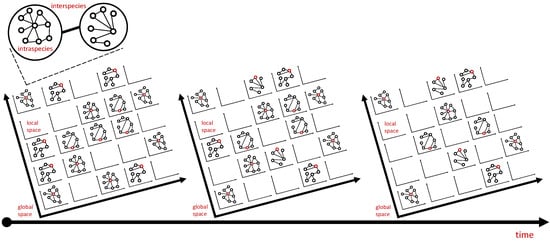 Multiscale investigation of overdispersion. At the top part of the figure, overdispersion can happen at the species population network and also at the interspecies (or intercommunity) network. Food chain or web, predation, parasitism, and other interactions can characterize interspecies network. At the middle part of the figure, overdispersion can be investigated at a certain locality and at the macroscale (global) spatial level. Spatial investigation can be analyzed using a grid system, depending on the availability of data and on the spatial homo/heterogeneity of the interaction networks. For simplicity, a 2D spatial representation is presented here, but a 3D representation can also be performed. Moreover, spatial overdispersion can be dynamic through time. The distribution of parasites in host population can vary and evolve spatially and temporally.