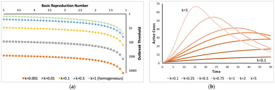Effect of heterogeneity and overdispersion in epidemics. In both figures, near zero represents more heterogeneity and high overdispersion. (a) 90% probability, is assumed to be equivalent to a homogeneous transmission; (b) represents random transmission (e.g., Poisson-distributed spread of infectious disease).