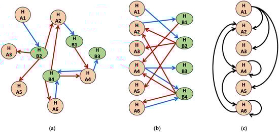 Interaction network among hosts. Blue line denotes transmission from Host species A to Host species B (e.g., parasite eggs from main host to intermediary host). Red line denotes transmission from Host species B to Host species A (e.g., parasite larva from intermediary host to main host). The lines can also be weighted based on volume of parasite loading. (a) sample network; (b) network is converted to a bipartite graph; (c) graph projection where black lines denote transmission interaction via an intermediate host. Note that a multipartite (e.g., tripartite) interaction network can also be studied to account for the role of the parasites.