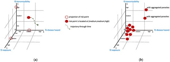 Force of infection as risk is represented as a triple (f1, f2, and f3) meaning value of disease hazard, value of exposure, and value of transmissibility. (a) example of a risk point, which characterizes status of one individual host for a specific time frame; (b) collection of risk points, which characterizes host population.