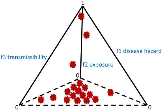 Simplex of risk points that could characterize host population with parasite aggregation. High-risk individual hosts could have high parasite burden. Each red dot could represent an individual host.