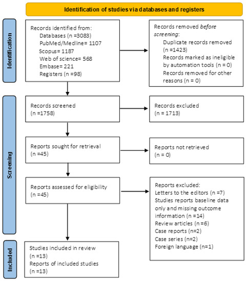 Figure 1 outlines the summary of the selection process. On the initial search of electronic databases and registers, we identified 3181 reports (1107 from PubMed/Medline, 1187 from Scopus, 568 from web of science, 221 from Embase, and 98 from Registers). After removing 1423 duplicate records, 1758 articles were screened, and finally, 45 reports were considered for eligibility. Of these 45 articles, 13 studies fulfilled the selection criteria and were included in the final analysis. Eight studies [11,13,15,16,17,18,19,20] used random control adjusted for age, sex, GP practice, or birth year.