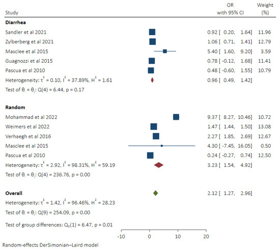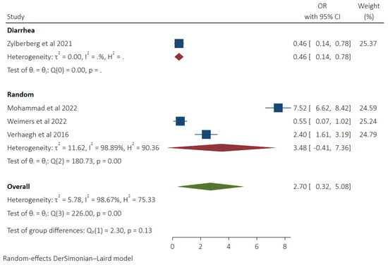 H2 receptor antagonist use was not associated with increased odds of MC (OR 2.70, 95% CI −0.32–5.08, I2 98.67%) based on the data provided in four studies [9,17,18,19]. Lower odds of MC were seen in patients using H2RA compared to the diarrhea control group (OR 0.46, 95% CI 0.14–0.78, I2 0%). Similar odds of MC were seen compared to the community control patient population (OR 3.48, 95% CI −0.41–7.36, I2 98.89%). No significant difference was seen between the groups (p 0.13) (Figure 6).