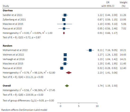 Nine studies [8,9,12,13,17,18,19,21,22] reported the odds of microscopic colitis in patients using proton pump inhibitors. Studies by Masclee et al. [21] and Pascua et al. [22] reported two different Odds ratios based on the control groups (Community random and diarrhea controls). Pooled Odds of MC in patients taking PPIs were 2.65 (95% CI 1.81–3.50, I2 98.13%). On subgroup analysis, lower odds of MC (OR 0.68, 95% CI 0.48–0.88, I2 7.26%) were found compared to the diarrhea control group, while greater odds were seen compared to the random control group (OR 4.55, 95% CI 2.90–6.19, I2 98.13%). A statistically significant difference was seen between the groups (p < 0.0001) (Figure 2).