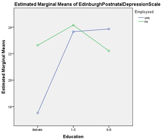 Table 6 shows the main effect of education on postpartum depression, which was found to be significant (F (2, 317) = 15.34, p < 0.001), while, the main effect of employment on postpartum depression was also found to be significant (F (2, 317) = 4.64, p < 0.05). Moreover, the interaction between education and employment was found to be significant (F (2, 317) = 10.04, p < 0.001). The results also show that women who were educated (primary (M = 23.90) and middle (M = 23.02)) and unemployed (M = 22.99) experienced more postpartum depression compared to uneducated women (illiterate (M = 20.07)) who were employed (M = 21.67).