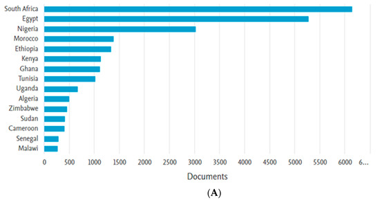 All countries retrieved were then ranked using an automated analysis option in Scopus per the number of COVID-19 publications. Then, the most productive African countries were selected by eliminating non-African countries. In addition, the dataset on the most productive African countries was confirmed by a separate advance query string with specific African countries. For example, data on Nigeria were retrieved using the string below: