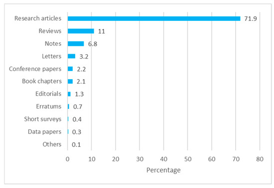 Of the 1112 publications from Ghana, the majority (71.9%) were research articles, followed by reviews that formed 11% of the total publications during the period from 2019–2022. Notes, letters, and conference papers represented 6.8%, 3.2%, and 2.2% of the total publications, respectively. Editorials represented 1.3%. The rest were below 1% each of COVID-19 publications. These data are represented in Figure 2.