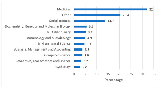 Ghana’s publication output in COVID-19 research from 2019–2022 occurred in the context of more than 10 subject areas, as shown in Figure 3 (according to subject-based database categorizations of scholarly journals). “Medicine” had the highest output with 32%, and “Social Sciences” had a 13.7% output. “Other” subject areas encompassing pharmacology, toxicology and pharmaceutics, nursing, and veterinary, among others, collectively represented 20.4%.