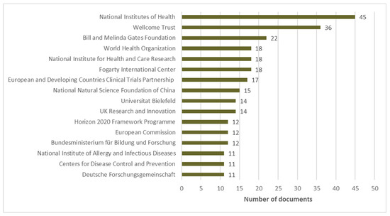 The top 16 sponsors of COVID-19/SARS-Cov-2 research in Ghana together funded 274 publications, representing 24.6% of the total research productivity and an average of 18 publications per sponsor. Three of the sponsors funded a higher number of research than the group average. These sponsors include the National Institutes of Health, Wellcome Trust, and the Bill and Melinda Gates Foundation which funded 45, 36, and 22 publications, respectively. Other sponsors include Fogarty International Center, the National Institute for Health and Care Research, and The World Health Organization, with each funding 18 publications. The European and Developing Countries Clinical Trials Partnership funded 17 publications, while the National Natural Science Foundation of China also sponsored 15 COVID-19 research in Ghana. The rest of the sponsors had fewer than 15 publications, with the last three sponsors providing funding for 11 publications each.