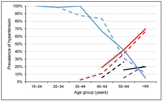 Our study found that the prevalence of hypertension increased with age in both males and females, corroborating previous investigations [8,22,23]. Age-related increase in blood pressure is partly explained by changes in the cardiovascular system, such as stiffening of the walls of the aorta and arteries in older age groups [24], which is due to the accumulation of molecular and cellular damage of the endothelial lining [25].