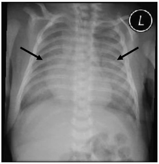 Chest radiography (CXR) (2 h after birth) revealed diffuse bilateral lung ground-glass opacities with air bronchograms (arrows); L = left.