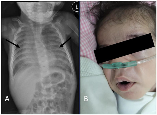 Chest radiography (CXR) (at 2 months) and the patient’s facial features at the age of 2 months: (A) CXR (at 2 months) revealed a persistent bilateral ground-glass appearance (arrows). (B) The patient at the age of 2 months showed mild dysmorphic facial features, including mild coarse facial features, a short and flat nose with wide nostrils, broad eyebrows with mild synophrys, and facial hypertrichosis. L, left.