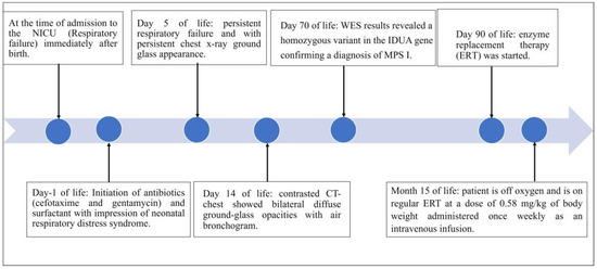 A plain chest X-ray revealed a persistent bilateral ground-glass appearance. An abdominal ultrasound revealed mild hepatosplenomegaly. The cranial ultrasound was normal, with no evidence of hydrocephalus. An echocardiography ultrasound system (iE33, Philips Medical Systems, Andover, MA, USA) at two months of age demonstrated normal heart function and structure without evidence of pulmonary hypertension. Due to the unavailability of enzyme replacement therapy (ERT) or hematopoietic stem cell transplantation, the patient was sent to a specialized center for further management. The patient is now 15 months old and has been successfully weaned off oxygen, only requiring oxygen during respiratory illnesses, and is on regular ERT at a dose of 0.58 mg/kg of body weight administered once weekly as an intravenous infusion (Figure 4). Figure 4 provides the patient’s diagnostic and therapeutic timelines.