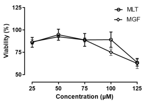 For MGF and/or MLT to be used therapeutically, they will need to be devoid of harmful effects. Thus, to assess the safety profile of MGT/MLT, we analyzed cell viability in 3T3-L1 preadipocytes exposed to these two bioactive compounds. Preadipocyte 3T3-L1 cells were cultured in the presence of MGF (0, 25, 50, 75, 100, and 125 µM) and MLT (0, 25, 50, 75, 100, and 125 µM) for 24 h. When cells were incubated with increasing doses of both MLT and MGF, cell viability remained >75% in cells treated with concentrations of up to 100 µM. However, at a concentration of 125 µM, viability was shown to decrease <75% (Figure 2). Based on these results, we selected a 100 µM dosage of MGF/MLT to treat 3T3-L1 cells to maximize efficacy while preventing excessive cellular toxicity.