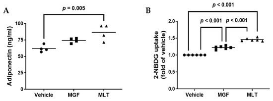 Body mass index, blood pressure, fasting glycemia, insulin resistance, and serum insulin levels are all inverse relationships with serum adiponectin levels [30]. Adiponectin is one of the most abundantly released proteins from human adipose tissue [31]. In agreement with a previous study [32], we detected a significant difference in the amount of adiponectin secreted in 3T3-L1 cells exposed to MLT or when compared to vehicle control cells (Figure 4A). However, there were no reported significant differences in MGF-treated cells compared to vehicle-treated 3T3-L1 cells. This implies that MLT may demonstrate properties that enhance adiponectin secretion that extends beyond MGF-dependent effects.