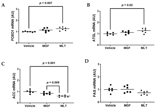 FOXO1 inhibits adipocyte differentiation via insulin signaling [39]. ATGL is one of the main rate-limiting enzymes in triglyceride lipolysis, which account for a predominant proportion of the triglyceride hydrolysis activity of adipose tissue [40]. ACC and FAS are vital enzymes for the de novo lipogenesis pathway [14,41]. We identified significant changes in the mRNA expression levels of FOXO1, ATGL, and ACC in cells incubated with MLT compared to vehicle control cells (Figure 5A–C). A significant increase was observed between MLT-treated and vehicle-treated 3T3-L1 cells for FOXO1 and ATGL (Figure 5A,B). In contrast, ACC was significantly decreased in MLT- and MGF-treated cells compared to vehicle-treated 3T3-L1 cells (Figure 5C). However, no significant differences were reported among the three treatments for FAS mRNA expression (Figure 5D). Therefore, these results indicate that MLT may demonstrate the ability to regulate adipogenesis by altering glucose/insulin-responsive genes in adipocytes.