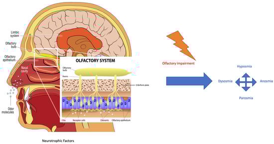 The COVID-19 (coronavirus disease 19) outbreak has rapidly spread around the world since December 2019, resulting in more than 700 million confirmed cases and 6.5 million reported deaths from the virus. Symptoms reported by SARS-CoV-2 (severe acute respiratory syndrome coronavirus 2) infected patients include fever, dyspnoea, olfactive impairment, anosmia, dysgeusia, myalgia, malaise, headache, sore throat, rhinorrhoea, diarrhoea, nausea/vomiting, nasal and conjunctival congestion, and neurological symptoms defined as neurocovid [1]. The prevalence of olfactory dysfunction in patients with COVID-19 is estimated at 52.73% [2]. The work of Kaye et al. reported anosmia in nearly 73% of patients and showed that the symptom preceded the diagnosis of COVID-19. Another interesting finding is that anosmia was the initial symptom in over 26.6% of these patients. Although most COVID-19-related olfactory dysfunctions seem to recover after a short time, i.e., within 30 days, some patients have reported long-term anosmia [3]. From an anatomical–physiological point of view, the nasal cavity is lined by two different types of epithelia: respiratory and olfactory epithelium. The respiratory epithelium is pseudostratified columnar epithelium consisting of ciliated cells, secreting goblet cells, and basal cells [4]. It represents a major part of the mucous membrane of the nasal cavities. The olfactory epithelium is responsible for the perception of olfactory sensation and consists of at least five cell types: sustentacular cells, olfactory sensory neurons (OSNs), microvillar cells, basal cells, and Bowman’s glands. OSNs express, on cilia membranes, G-protein-coupled receptors for the detection of odorant molecules by odorant binding-induced activation. This activation results in the stimulation of adenylate cyclase and the formation of cyclic adenosine monophosphate, which leads to the opening of cyclic nucleotide-gated channels for the influx of sodium and calcium ions and subsequent calcium-activated efflux of chloride ions at the olfactory cilia, creating a receptor potential for triggering action potentials at the soma. They are bipolar neurons and therefore form synapses with the olfactory bulb through their axons which project into the nasal lamina propria and the cribriform plate (Figure 1) [4]. Each olfactory sensory neuron has a single type of olfactory receptor, the signals of which are convergently transmitted to one or two glomeruli and thereby connecting tufted and mitral cells in the olfactory bulb. These cellular axons are assigned to various olfactory areas in the central nervous system [4].