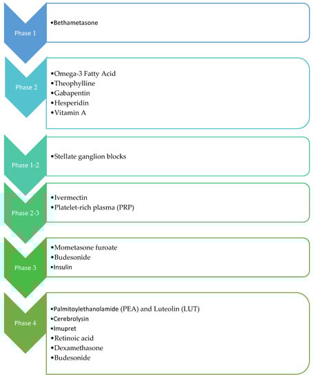 In the only clinical trial in phases 1–2, a single cohort study was utilized to generate pilot data on the efficacy and safety of sequential stellate ganglion blocks for the treatment of COVID-19-induced olfactory dysfunction and other long COVID symptoms [34]. This hypothesis was suggested because other symptoms, such as chronic dyspnoea, impaired memory capacity, significant fatigue in positive sympathetic feedback loops, and dysautonomia, were observed. This study proposed to block stellate ganglion and hyper-sympathetic activation by inhibiting sympathetic neuronal firing and resetting the balance of the autonomic nervous system. After ultrasound guidance identification, 1% lidocaine or 1% mepivacaine was injected near the ganglion stellate. They assessed the efficacy with UPSIT, C-GIT, and ODOR at baseline, after 1 week, and after 1 month. The recruitment status was completed, but no study results were posted on ClinicalTrials.gov.