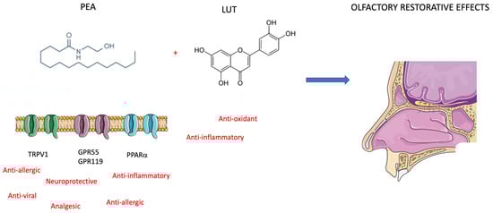 Mechanism of action of PEA and LUT. The effects protective on olfactory epithelium are restorative on post-COVID-19 anosmia (see text for description).