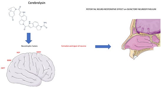 Cerebrolysin stimulates a neurotrophic effect on neuronal cells. The therapeutic effect of Cerebrolysin is attributable to a potential neuro-restorative effect of the olfactory neuroepithelium (see text for description).