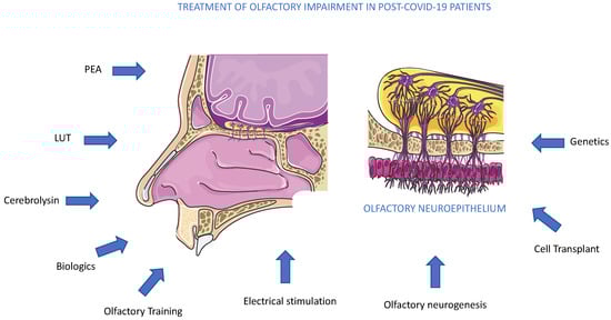 We discussed several therapeutics employed in several anosmia clinical trials, and among active trials, PEA and Cerebrolysin represented promising molecules acting to reduce olfactory impairment (Figure 6). As an alternative to drug administration, other methods could also be used. Conversely, another promising approach to olfactory loss could arrive from the activation or replacement of stem cell populations inside the olfactory epithelium. More recently, a new mouse model of inducible hyposmia was generated, and purified tissue-specific stem cells were shown to engraft intranasally to produce olfactory neurons, resulting in the recovery of function [74] (Figure 6). In addition to genetic, electrophysiological, and behavioral assays performed in adult mice, the authors explored, in vitro, the mechanisms promoting stem cell expansion of adult olfactory basal progenitor cells competent for engraftment, paving the way for a potential translational therapeutic approach [75]. Previously, we suggested that the pandemic boosted the occurrence of studies on olfactory diseases, and great efforts are required by the scientific community to explore new therapeutic avenues [4,76]. Olfactory dysfunction therapy can obtain new opportunities from several research areas, such as biologic therapies, with dupilumab, which has shown remarkable improvement in smell loss for chronic rhinosinusitis nasal polyposis patients [77] (Figure 6). Biologics therapy for improvement in olfactory function is not planned in anosmia to date and implementing this alone or joined with other standard treatments could be a future perspective (Figure 6). On the other side, a major effort could be performed in the diagnosis of smell dysfunction in specific populations. Recently, it was evidenced that the omicron variant caused less olfactory dysfunction than previous variants of SARS-CoV-2 alpha or delta. The reported prevalence differs greatly between populations, probably due to genetic differences, as suggested by a genome-wide association study that connected a gene locus encoding an odorant-metabolizing enzyme, UDP glycosyltransferase, to the extent of COVID-19-related olfactory impairment [78]. In conclusion, the aim to obtain an efficacy treatment for anosmia in post-COVID-19 patients will be a result of a combination of pharmacological, genetic, and electrophysiological studies, observing that anosmia is often present in a neurocovid context, a complex and articulated syndrome, where an alliance between researchers and physicians is necessary [79].