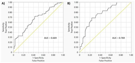 (A). Receiver operating characteristic curve for the model of the relationship between selected indices (explained in the description of statistical methods) and new LBBB appearance after AVR procedure—multivariate analysis. (B). Receiver operating characteristic curve for the model of the relationship between selected indices (explained in the description of statistical methods) and persistent new LBBB following 1 year of follow-up after AVR procedure—multivariate analysis. AUC: area under the curve.