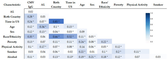 Correlation matrix of AL Risk, CMV IgG, and sociodemographic factors (Cramer’s V statistic) (* statistically significant association, p-value < 0.05).