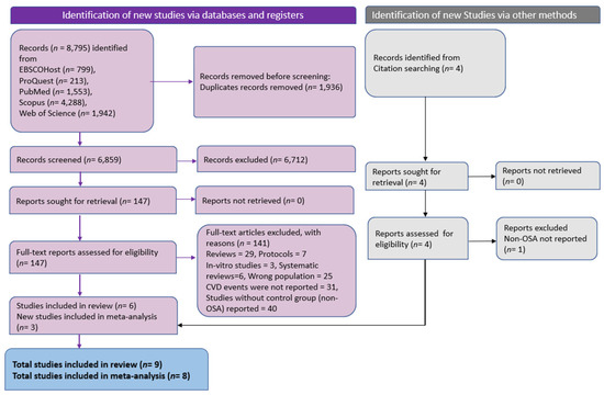 The process of conducting a systematic literature search and selecting relevant studies is presented in Figure 1. In the primary literature search, we found 8795 articles from multiple databases. Among these, 1936 studies were recognized as duplicates and omitted. Following the removal of duplicates, 6859 records underwent primary screening through title and abstract analysis. Of these, 6712 studies were deemed irrelevant and excluded, leaving 147 for full-text review. After thoroughly examining these studies, 141 articles were excluded based on predetermined criteria. Of these, 29 were narrative reviews, 6 were systematic reviewers, 7 were protocols, 25 had incorrect populations, 31 did not report the number of CVD events, 3 were in vitro studies, and 40 were without a control group. To identify additional studies, cross-reference checking was performed. In total, nine studies met the inclusion criteria, of which eight were eligible for meta-analysis. Six studies were obtained through the implemented search strategy, while the remaining three were identified through other methods.