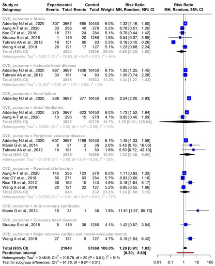 Data from eight independent studies were analyzed using a random-effects model. The findings revealed varying RR values for different CVD conditions: for stroke, RR was 0.69 (95% CI: 0.30–1.59) with a p-value of 0.30; for ischemic heart disease (IHD), RR was 1.34 (95% CI: 1.21–1.43) with a p-value of 0.01; RR for atrial fibrillation (AF) was 1.29 (95% CI: 0.01–125.64) with a p-value of 0.60; for peripheral vascular disease (PVD), RR was 1.82 (95% CI: 0.48–6.96) with a p-value of 0.19; and myocardial infarction (MI) yielded an RR of 1.24 (95% CI: 0.50–3.10) with a p-value of 0.512.