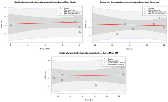 Meta-regression was conducted to examine the potential impact of mean HbA1c, BMI, and age on the results. However, none of the variables were found to be significantly associated with the results (p = 0.8451 for age, p = 0.8484 for BMI, and p = 0.7680 for HbA1c). Figure 3 shows a bubble plot that displays the relationship between the different variables with the result.