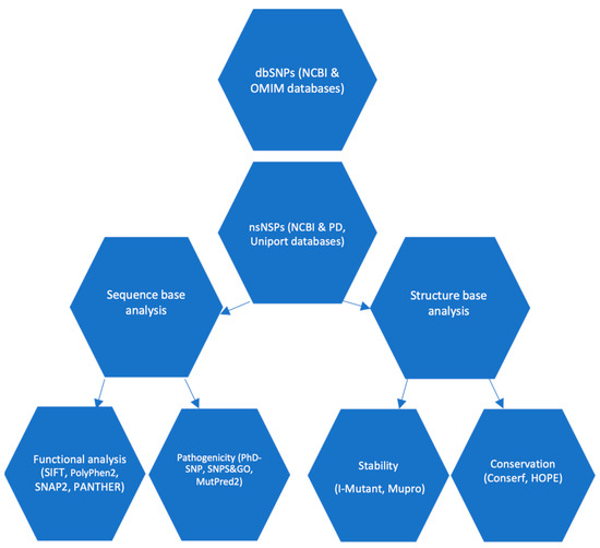 The current research utilized a computational approach that was in line with previous studies [19,20,21]. The study entailed the utilization of diverse bioinformatics tools to predict the harmful impacts of nsSNPs present in the SNCA gene and α-syn protein. Subsequently, nsSNPs exhibiting a high-risk profile were selected for further analysis, entailing an assessment of their degree of conservation, stability, and structural influence. The methodology utilized for the identification and categorization of potential functional nsSNPs in the SNCA gene is illustrated in Figure 1.
