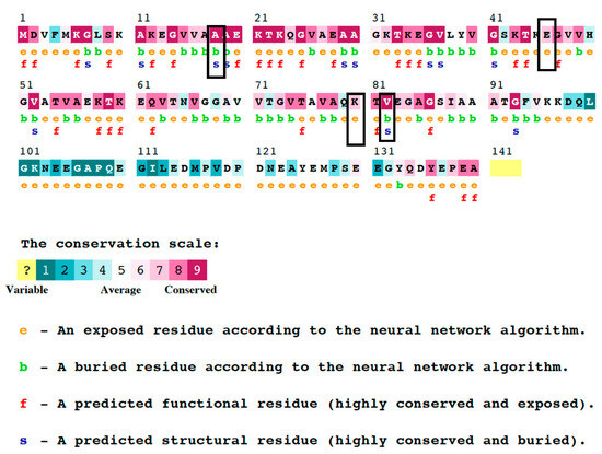The analysis of amino acid conservation is conducted through the utilization of the ConSurf web server, which can be accessed at https://consurf.tau.ac.il accessed on 23 May 2023. Through the evaluation of conservation levels, this algorithm is capable of discerning the functional regions present within a given protein. The conservation grades, which are assigned values between 1 and 9, serve as an indicator of the degree of evolutionary conservation exhibited by individual amino acids. According to Ashkenazy et al., 2010 [29], the conservation level is rated on a scale of 1 to 9, where a grade of 9 represents the highest conservation and a grade of 1 represents the lowest conservation.