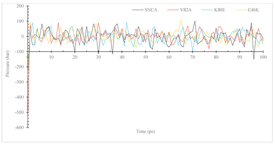 Simulation of the pressure changes over time for the α-Syn wildtype and mutant versions. The simulation was performed using the GROMACS program. The color black is used to symbolize the wildtype, whereas the colors red, blue, and yellow are used to represent the V82A mutant, K80E mutant, and yellow to represent the E46K mutant.