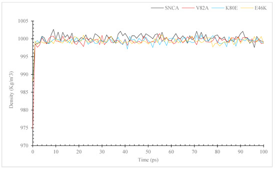 Simulation of the density changes over time for the α-syn protein wildtype and mutant versions. The simulation was performed using the GROMACS 5.1.2 program. The color black is used to symbolize the wildtype, whereas the colors red, blue, and yellow are used to represent the V82A mutant, K80E mutant and yellow to represent the E46K mutant.