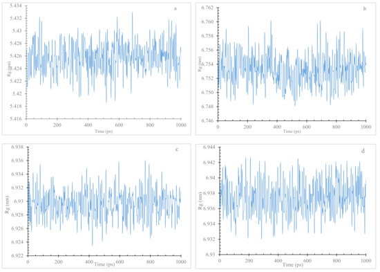 The Rg of C atoms in native and mutant α-Syn protein types. The wildtype (a), the V82A (b), the K80E (c), and the E46K (d).