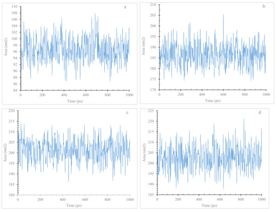 Solvent accessible surface area (SASA) of wildtype and mutant forms of α-Syn protein. Wildtype (a), V82A (b), K80E (c), and E46K (d) mutants.