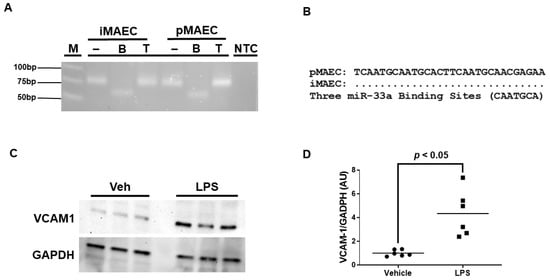 iMAEC expresses functional miR-33a-5p and exhibits pro-inflammatory properties in response to LPS exposure. (A) End-point RT-PCR and restriction digestion of amplicons assessed by agarose gel electrophoresis to detect miR-33a-5p within iMAEC and pMAEC positive controls. MiR-33a-5p cDNA contains one BsrDI restriction site but lacks TspRI restriction sites. M, DNA ladder; NTC, non-template control PCR reaction; minus (−), undigested amplicons; B, BsrDI-digested amplicons; T, TspRI-digested amplicons. (B) Three highly conserved miR-33a-5p binding sites are recognized within the 3′UTR of the ABCA1 gene for iMAEC and pMAEC positive controls. (C,D) Representative immunoblot (C) and densitometry (D) of vehicle-treated and LPS-challenged iMAEC for the quantification of VCAM-1 protein with GAPDH loading control. (D) Data points indicate two independent treatments with three biological replicates per respective treatment. Bars are group means, and Welch’s t-test was used to perform statistical analysis. AU, arbitrary units.