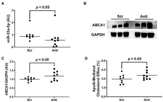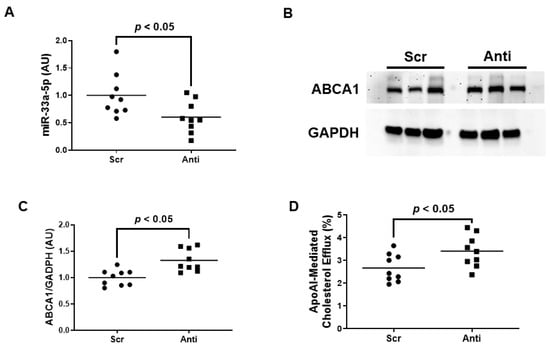 Transfecting inflamed iMAEC with pAntimiR33a5p enhances apoAI-mediated cholesterol efflux. LPS-challenged iMAEC were transfected with either pScr (Scr) or pAntimiR33a5p (Anti). (A) MiR-33a-5p expression measured in transfected pro-inflammatory iMAEC via RT-qPCR. (B,C) Representative immunoblot (B) and densitometry (C) of transfected pro-inflammatory iMAEC for the quantification of ABCA1 protein with GAPDH loading control. (D) Percent apoAI-mediated cholesterol efflux measured in transfected pro-inflammatory iMAEC. (A,C,D) Data points indicate three independent treatments with three biological replicates per respective treatment. Bars are group means, and a Student’s t-test was used to perform statistical analysis. (A,C) AU, arbitrary units.