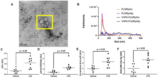 Characterization and cultured endothelial cell internalization efficiency of polymersome preparations. (A) Transmission electron micrograph of VHPK-decorated polymersomes. The polymersomes enclosed within the yellow box imply the aggregation of particles. (B) Particle number and size distribution of polymersome preparations determined by nanoparticle tracking analysis. (C–F) Plasmid DNA content (C,D) and transgene expression levels (E,F) were measured by qPCR or RT-qPCR, respectively, in vehicle-treated or LPS-challenged iMAEC exposed to either VHPK-PLMRpScr (C,E) or VHPK-PLMRpA5p (D,F). Data points indicate three independent treatments with three biological replicates per respective treatment. AU, arbitrary units. (C) Bars are group means, and Welch’s t-test was used to perform statistical analysis. (D) Bars are group medians, and a Mann-Whitney rank-sum test was used to perform statistical analysis. (E,F) Bars are group means, and a Student’s t-test was used to perform statistical analysis.