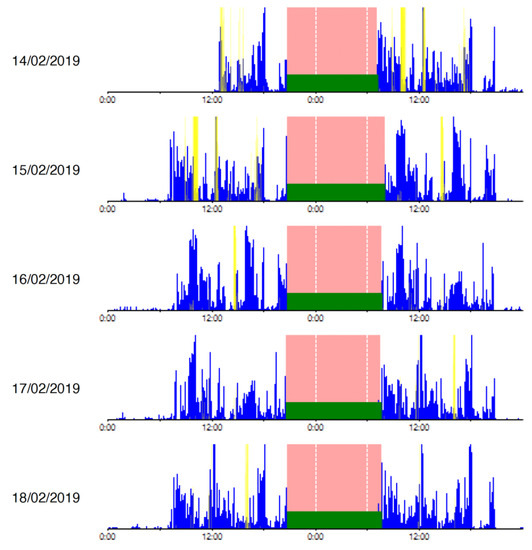 The average value and standard deviation of the actigraphic variables can be seen in Table 2, and an example of sleep detection carried out by ActiLife® with real data from our sample of participants can be seen in Figure 1. The filled areas represent sleep periods, and they show sleep that can be considered normal and stabilized. The graph shows how sleep lasts approximately 8 h every day, with hardly any awakenings and with a stable schedule.