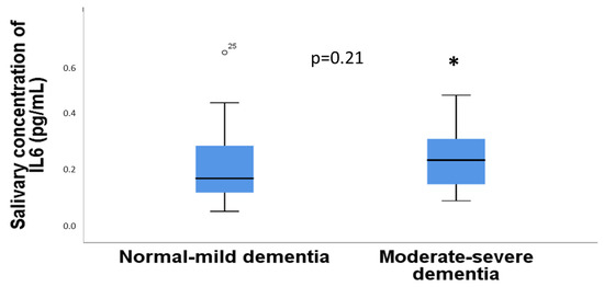 No significant correlations were found between the MMSE score and the concentration of IL6 in saliva (Rho = −0.13, p = 0.31, Spearman’s test). There were no significant differences between dementia and IL6 concentration (p = 0.38, Mann–Whitney U test).