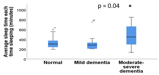 The dementia variable was categorized into three variables (0 = no cognitive impairment, 1 = mild cognitive impairment, and 2 = moderate/severe cognitive impairment). No significant differences were found between dementia and average daily time in bed (p = 0.06, Kruskall–Wallis test). Likewise, there were no significant differences between dementia and the average daily time out of bed (p = 0.06, Kruskall–Wallis test), or between dementia and efficiency (p = 0.75, Kruskall–Wallis test). On the other hand, significant differences were found between dementia and average sleep time (p = 0.04, Kruskall–Wallis test) (Figure 3). No significant differences were found between dementia and the other sleep parameters: number of awakenings (p = 0.77, Kruskall–Wallis test), total awakening time (p = 0.70, Kruskall–Wallis test), average awakening time (p = 0.69, Kruskall–Wallis test), and average time in bed when sleeping (p = 0.12, Kruskall–Wallis test).