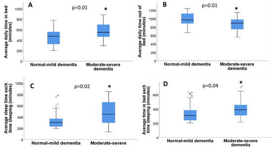 The dementia variable was, in turn, categorized into two variables (0 = normal/mild, 1 = moderate/severe). Since the number of participants with mild cognitive impairment was small, participants without cognitive impairment were grouped with those with mild cognitive impairment and participants with moderate and severe dementia were grouped together. Significant differences were found between dementia and the average daily time in bed (p = 0.01, Mann–Whitney U test), and between dementia and average daily time out of bed (p = 0.01, Mann–Whitney U test) (Figure 4A,B). There were no significant differences between dementia and efficiency (p = 0.45, Mann–Whitney U test), but there were significant differences between dementia and average sleep time (p = 0.02, Mann–Whitney U test) (Figure 4C). No significant differences were found between dementia and number of awakenings (p = 0.57, Mann–Whitney U test), between dementia and total awakening time (p = 0.45, Mann–Whitney U test), or between dementia and average awakening time (p = 0.74, Mann–Whitney U test). In addition, there were significant differences between dementia and the average time in bed when sleeping (p = 0.04 Mann–Whitney U test) (Figure 4D).